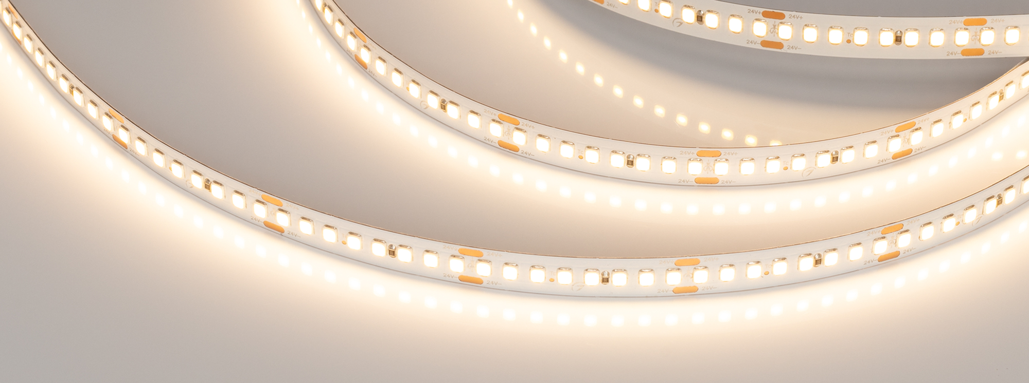 Светодиодная высокоэффективная лента RT серии A192. Светодиоды SMD 2835, 192 шт/м, белая плата шириной 10 мм, скотч 3M. Цвет ТЕПЛЫЙ 3000K, высокая световая эффективность 150 лм/Вт, индекс цветопередачи CRI>85, угол 120°. Питание 24 В, мощность 17.6 Вт/м (88 Вт на 5 м). Размеры 5000x10x1.6 мм. Мин. отрезок 41.67 мм, 8 светодиодов. Цена за 1 м. Обязательна установка на профиль.