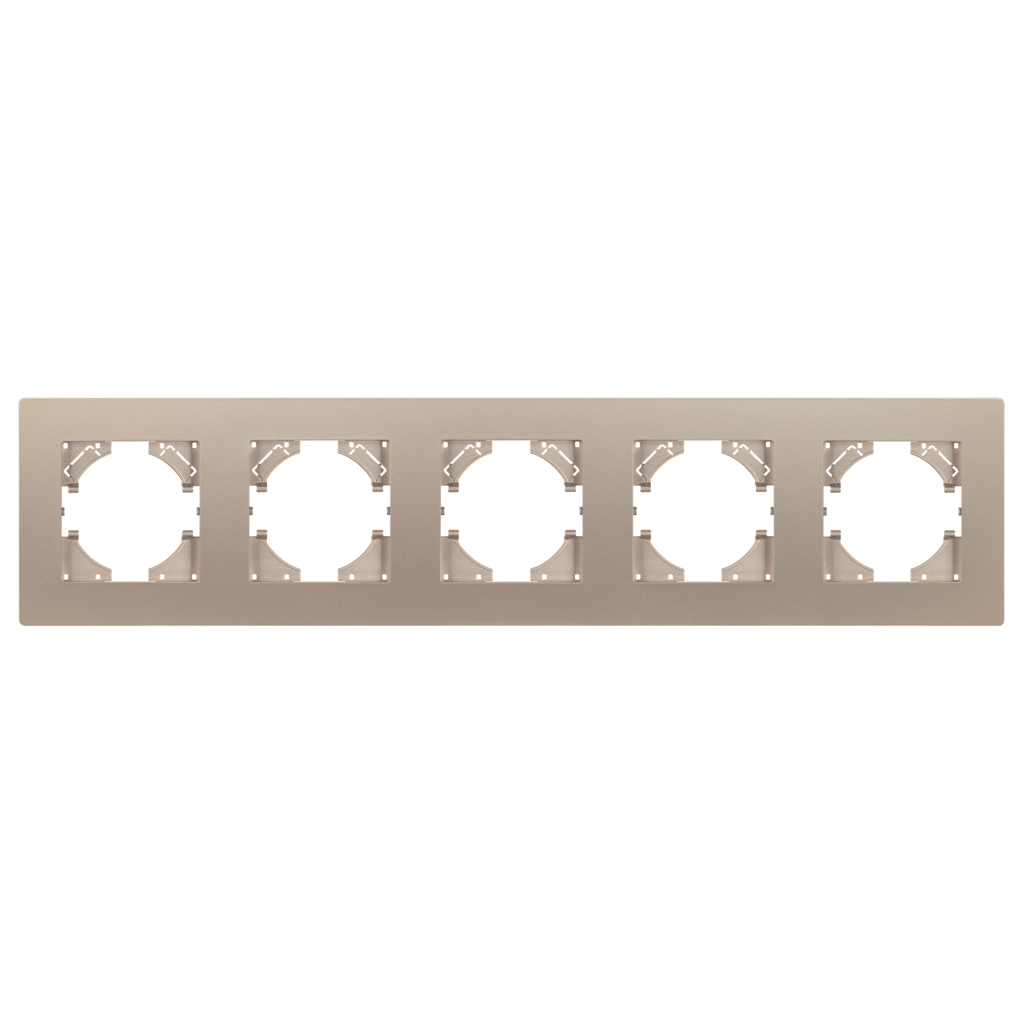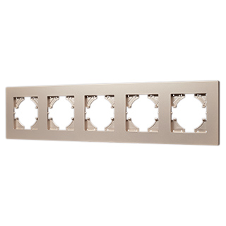 Рамка пластиковая на 5 постов, под встраиваемый механизм. Цвет - золотой. Среднего уровня герметичности IP20. Ориентация монтажа - горизонтальная (основным ориентиром служат посадочные выступы для накладки механизма).