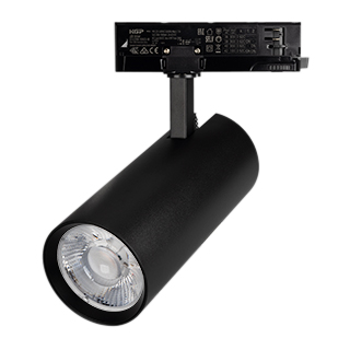 Светильник для треков/шин 4 провода. Мощность 40Вт, св. поток без решетки honeycomb 4000 лм, 100 лм/Вт, с решеткой honeycomb 2640 лм, 66 лм/Вт, дневной 4000 K, CRI>90, угол 36°, напряжение питания 230 В. Черный круглый корпус из алюминия, материал линзы PMMA, степень защиты IP20. Размер: диаметр 90 мм, длина световой части 141 мм. Монтаж на трек 3-фазный. Драйвер встроенный 24-42 В, 750мА., пульсация <5%