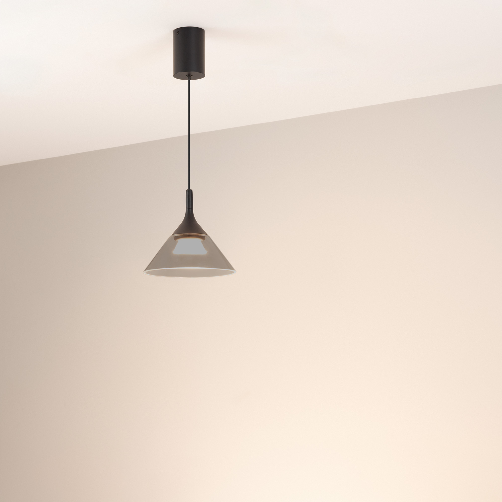 Подвесной светильник. Мощность 7 Вт, св. поток 355 лм, 50 лм/Вт, теплый 3000К, CRI>94, угол 30°, напряжение питания 230 В. Черный корпус из алюминия с конусообразным стеклянным плафоном дымчатого цвета, степень защиты IP20. Размер: диаметр плафона 200 мм, высота плафона 180 мм. Монтаж подвесной, длина подвеса 1500 мм, регулируемая. Габариты чаши (накладная) Ø75 x 120 мм. Драйвер 25-40 В, 150 мА, пульсация <1%.