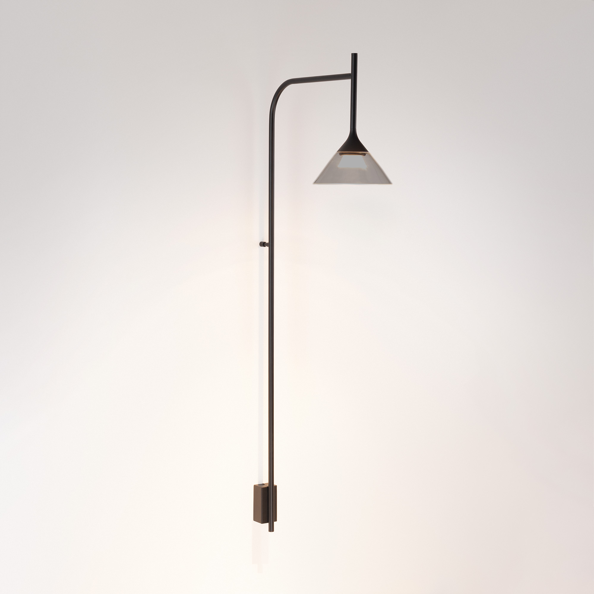 Настенный светильник. Мощность 7 Вт, св. поток 355 лм, 50 лм/Вт, теплый 3000К, CRI>94, угол 30°, напряжение питания 230 В. Черный корпус из алюминия с конусообразным стеклянным плафоном дымчатого цвета, степень защиты IP20. Размеры: диаметр плафона 200 мм, высота плафона 180 мм, высота светильника 1010 мм. Монтаж настенный. Драйвер 12В, 750 мА, пульсация <1%.